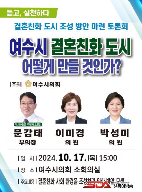 [½Åµ¿¾Æ¹æ¼ÛÀü³²¿©¼ö=±è±â³² ±âÀÚ] ¿©¼ö½ÃÀÇȸ(ÀÇÀå ¹éÀμ÷)´Â ¿À´Â 10¿ù 17ÀÏ ¸ñ¿äÀÏ ¿ÀÈÄ 15½Ã¿¡ ¿©¼ö½ÃÀÇȸ ¼ÒȸÀǽǿ¡¼­ ¹®°©Å ºÎÀÇÀå, ȯ°æº¹ÁöÀ§¿øÈ¸ ÀÌ¹Ì°æ ºÎÀ§¿øÀå, ±âȹÇàÁ¤À§¿øÈ¸ ¹Ú¼º¹Ì ÀÇ¿øÀÌ ÁÖÃÖÇÏ´Â '¿©¼ö½Ã °áȥģȭµµ½Ã Á¶¼º ¹æ¾È ¸ð»ö' ¡¸¿©¼ö½Ã °áȥģȭµµ½Ã ¾î¶»°Ô ¸¸µé °ÍÀΰ¡?¡¹ ¸¦ ÁÖÁ¦·Î Á¤Ã¥ Åä·Ðȸ¸¦ °³ÃÖÇÑ´Ù°í ¹àÇû´Ù.
