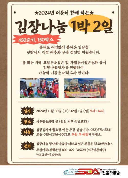 ¡¸´õºÒ¾î ÇÔ²² ÇÏ´Â ±èÀ峪´® 1¹Ú 2ÀÏ¡¹Çà»ç´Â ¡®¼­±¸¹ÎÁßÀÇÁý¡¯°ú ¡®ÀÎõ¼­±¸Áö¿ªÀÚȰ¼¾ÅÍ¡¯°¡ °øµ¿À¸·Î 13ȸ° ÃßÁøÇÏ´Â Çà»çÀÌ´Ù. ¿ÃÇØ´Â û³â¼ºÀåÇÁ·ÎÁ§Æ® û³âµé°ú ÇÔ²² ÀÚ¸³Áغñû³â ¹× µµ¿òÀÌ ÇÊ¿äÇÑ Ã»¼Ò³âÀ» À§ÇØ 450Æ÷±â ±èÀåÀ» ÇÏ¿© ³ª´®À» ÇÒ ¿¹Á¤ÀÌ´Ù.