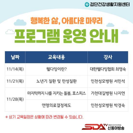 ù°ÁÖ¿¡´Â ¡®À£´ÙÀ×À̶õ ¹«¾ùÀÎÁö, ¶Ç ¿Ö ÇÊ¿äÇÑÁö¡¯¿¡ ´ëÇØ, µÑ°ÁÖ¿¡´Â ¡®³ë³â±â¿¡ °Þ°Ô µÇ´Â Áúȯ°ú ´ëó ¹æ¹ý¡¯, ¼¼¹øÂ° ½Ã°£¿¡´Â ¡®¸¶Áö¸·±îÁö ³ª¸¦ ÁöŰ´Â µ¹º½°ú È£½ºÇǽº¡¯¿¡ ´ëÇØ ±³À°À» ÁøÇàÇÒ ¿¹Á¤ÀÌ´Ù. ¶Ç ÃÖ±Ù ³ë³âÃþ¿¡¼ ¸¹Àº °ü½ÉÀ» °¡Áö°í ÀÖ´Â ¿¬¸íÀÇ·á°áÁ¤Á¦µµ¿¡ ´ëÇØ¼µµ ÀÚ¼¼È÷ ¼³¸íÇÒ ¿¹Á¤ÀÌ´Ù.