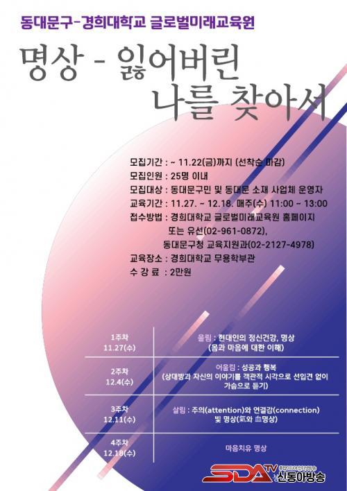 ¡®¸í»ó-ÀÒ¾î¹ö¸° ³ª¸¦ ã¾Æ¼¡¯ °Á´ À̷аú ½Ç½ÀÀ» º´ÇàÇØ ÀڽŰú ŸÀο¡ ´ëÇÑ ÀÌÇØ¸¦ ³ôÀÌ°í ¸¶À½ Ä¡À¯¸¦ µµ¸ðÇÏ´Â ÇÁ·Î±×·¥À¸·Î, ÃÑ 4ȸÂ÷·Î ÁøÇàµÈ´Ù. °ÀÇ´Â Çö´ëÀÎÀÇ Á¤½Å°Ç°°ú ¸í»ó(¿ï¸²), ¼º°ø°ú Çູ(¾î¿ï¸²), ÁÖÀÇ¿Í ¿¬°á°¨À» ³ôÀÌ´Â ºû ¸í»ó(»ì¸²), ¸¶À½ Ä¡À¯ ¸í»óÀ¸·Î ±¸¼ºµÈ´Ù. ÇØ´ç °ÀÇ´Â 11¿ù 27ÀϺÎÅÍ 12¿ù 18ÀϱîÁö ¸ÅÁÖ ¼ö¿äÀÏ ¿ÀÀü 11½ÃºÎÅÍ ¿ÀÈÄ 1½Ã±îÁö °æÈñ´ëÇб³ ¹«¿ëÇкΰü¿¡¼ ¿¸°´Ù.