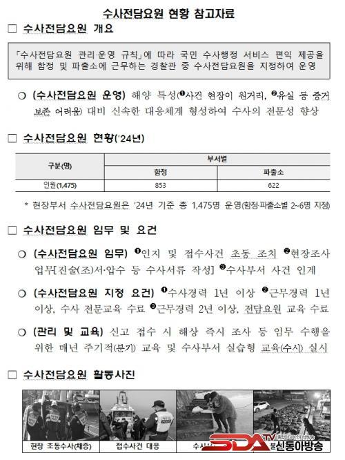 ¼ö»çÀü´ã¿ä¿øÀº °æºñÇÔÁ¤ ¹× ÆÄÃâ¼Ò µî ÇöÀåºÎ¼­¿¡¼­ ¼ö»ç¾÷¹«¸¦ Àü´ãÇÏ´Â °æÂû°üÀ¸·Î, Áõ°¡ÇÏ´Â ÇØ¾ç¹üÁË¿¡ ´ëÇÑ È¿À²Àû ´ëÀÀ°ú Ãʵ¿¼ö»ç·Â °­È­¸¦ ÅëÇÑ ¼ö»çÀÇ Àü¹®¼ºÀ» ³ôÀ̱â À§ÇØ À̹ø °æÁø´ëȸ¸¦ ½Ç½ÃÇÏ¿´´Ù.