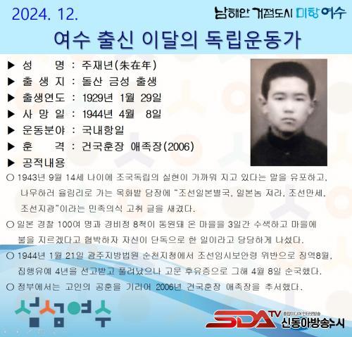 ¿©¼ö½Ã, 12¿ùÀÇ µ¶¸³¿îµ¿°¡ µ¹»ê ±Ý¼º Å»ý ¡®ÁÖÀç³â ¼±»ý¡¯ ¼±Á¤