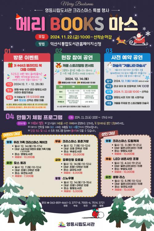 ÀÍ»ê½Ã´Â '¸Þ¸® ºÏ½º(BOOKS) ¸¶½º'¸¦ ÁÖÁ¦·Î 12¿ù ÇÑ ´Þ µ¿¾È ¿µµî¡¤ºÎ¼Û¡¤À¯Ãµ¡¤±Ý¸¶¡¤È²µî µî 5°³ ½Ã¸³µµ¼­°ü¿¡¼­ µ¶¼­¹®È­ Çà»ç¸¦ ¿î¿µÇÑ´Ù°í 2ÀÏ ¹àÇû´Ù.