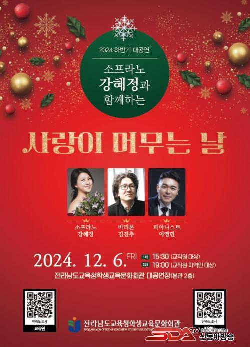 ¿À´Â 12¿ù 6ÀÏ ¿ÀÈÄ 3½Ã30ºÐ°ú Àú³á 7½Ã Àü³²±³À°Ã»Çлý±³À°¹®Èȸ°ü ´ë°ø¿¬Àå¿¡¼¡®»ç¶ûÀÌ ¸Ó¹«´Â ³¯¡¯À̶ó´Â ÁÖÁ¦·Î ÆîÃÄÁö´Â À̹ø °ø¿¬Àº ´º¿åŸÀÓÁî°¡ ±ØÂùÇÑ ¼¼°èÀûÀÎ ¼ÒÇÁ¶ó³ë °ÇýÁ¤°ú ±¹¸³¿ÀÆä¶ó´Ü »ó±Ù´Ü¿øÀ» ¿ªÀÓÇÑ ¹Ù¸®Åæ ±èÁøÃß, ¹ÝÁÖ°èÀÇ °ÅÀå ´ÞÅæ ¹ßµåÀ©À¸·ÎºÎÅÍ ¿øÅÍÇ® ÇǾƴϽºÆ®¶ó´Â ÆòÀ» ¹ÞÀº ÇǾƴϽºÆ® ÀÌ¿µ¹ÎÀÌ Ãâ¿¬ÇØ È·ÁÇÑ °ø¿¬À» ¼±»çÇÒ ¿¹Á¤ÀÌ´Ù.