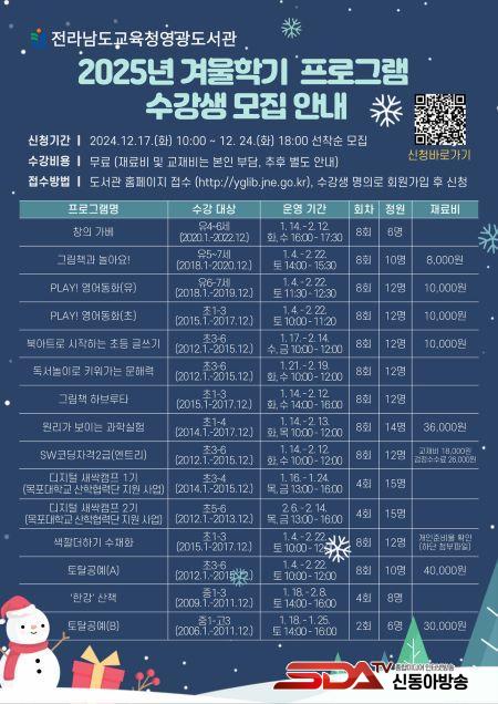 [½Åµ¿¾Æ¹æ¼Û Àü³²¿µ±¤=À̽ŵ¿±âÀÚ] Àü¶ó³²µµ±³À°Ã»¿µ±¤µµ¼­°üÀº 2025³â °Ü¿ïÇбâ ÇÁ·Î±×·¥À» °³¼³ÇÏ°í ¿À´Â 12¿ù 17ÀϺÎÅÍ 24ÀϱîÁö ¼ö°­»ýÀ» ¸ðÁýÇÑ´Ù.