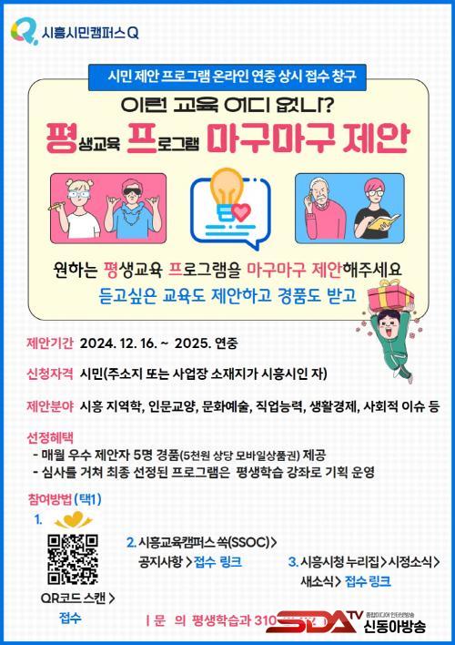 ¡®Æò»ýÇнÀ ÇÁ·Î±×·¥ ¸¶±¸¸¶±¸ Á¦¾È¡¯Àº 2024³â 12¿ù 16ÀϺÎÅÍ 2025³â ¿¬¸»±îÁö ÁøÇàµÇ¸ç, ½ÃÈï½Ã¿¡ ÁÖ¼Ò³ª »ç¾÷ÀåÀÌ ÀÖ´Â ½Ã¹ÎÀ̶ó¸é ´©±¸³ª Âü¿©ÇÒ ¼ö ÀÖ´Ù.
