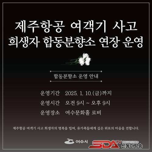 ¿©¼ö½Ã, Á¦ÁÖÇ×°ø ¿©°´±â »ç°í Èñ»ýÀÚ ÇÕµ¿ºÐÇâ¼Ò ¿¬Àå ¿î¿µ 1¿ù 10ÀϱîÁö¡¦¸ÅÀÏ ¿ÀÀü 9½Ã~¿ÀÈÄ 9½Ã ¿î¿µ |