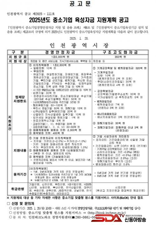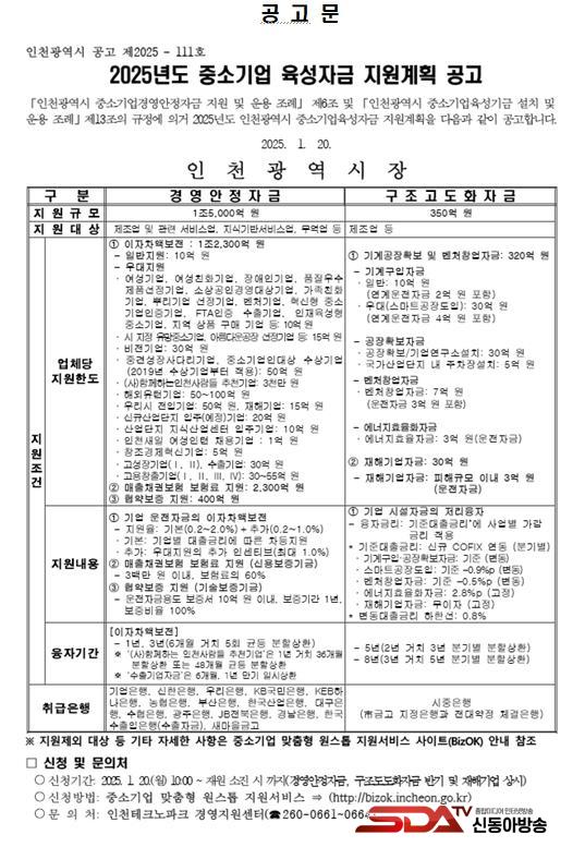 ±â¾÷ÀÌ Áß¼Ò±â¾÷ À°¼ºÀÚ±Ý Áö¿øÀ» ¹ÞÀ¸·Á¸é 1¿ù 20ÀϺÎÅÍ ÀÎõ½Ã Áß¼Ò±â¾÷ ¸ÂÃãÇü Áö¿ø ½Ã½ºÅÛÀÎ ºñÁî¿ÀÄÉÀÌ(BizOK)(http://bizok.incheon.go.kr)¸¦ ÅëÇØ ½ÅûÇÒ ¼ö ÀÖ´Ù. º¸´Ù ÀÚ¼¼ÇÑ ³»¿ëÀº ÀÎõ½Ã ȨÆäÀÌÁö °í½Ã¡¤°ø°í¿¡¼ È®ÀÎÇÒ ¼ö ÀÖÀ¸¸ç, ±âŸ ¹®ÀÇ´Â ÀÎõÅ×Å©³ëÆÄÅ© °æ¿µÁö¿ø¼¾ÅÍ(¢Ï260-0661~4)·Î ÇÏ¸é µÈ´Ù.