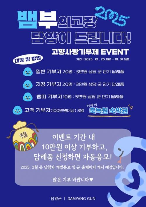 À̹ø À̺¥Æ®´Â 1¿ù 25ÀϺÎÅÍ 31ÀϱîÁö ÁøÇàµÇ¸ç, ±â°£ ³» ´ã¾ç±º¿¡ 10¸¸ ¿ø ÀÌ»ó °íÇâ»ç¶û±âºÎÀÚ¸¦ ´ë»óÀ¸·Î ÀϹݱâºÎ(ÀÚÄ¡´Üü¿¡ ±âºÎÇϱâ) Âü¿©ÀÚ ¹× ÁöÁ¤±âºÎ(ƯÁ¤ »ç¾÷¿¡ ±âºÎÇϱâ) Âü¿©ÀÚ¸¦ °¢ 20¸í¾¿ Ãß÷ÇÑ´Ù.