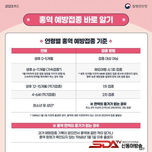 ´ÙÇàÈ÷ È«¿ªÀº ¹é½Å Á¢Á¾À¸·Î 90% ÀÌ»ó ¿¹¹æÀÌ °¡´ÉÇÏ´Ù. È«¿ª¹é½Å(MMR)À» 2ȸ ¸ðµÎ Á¢Á¾Çß´ÂÁö È®ÀÎÇϰí, Á¢Á¾ ¿©ºÎ°¡ ºÒÈ®½ÇÇÑ °æ¿ì Ãâ±¹ 4~6ÁÖ Àü 2ȸ Á¢Á¾(ÃÖ¼Ò 4ÁÖ °£°Ý)À» ¿Ï·áÇØ¾ß ÇÑ´Ù.