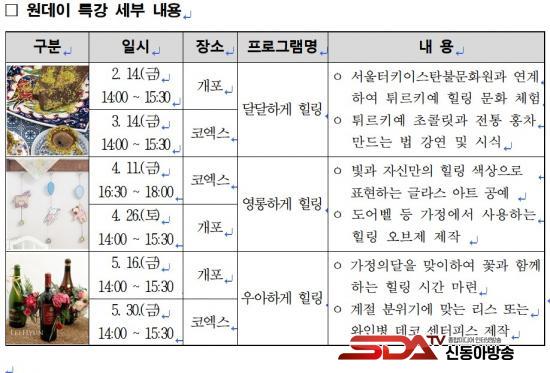 ÇÑÆí, ¼¾ÅÍ´Â Á¤±Ô ÇÁ·Î±×·¥ ¿Ü¿¡µµ Èú¸µ ºÐ¾ß Àü¹®°¡¸¦ ÃÊûÇÑ ¸í»ç Ư°(»ó¹Ý±â)°ú ¿¹¼ú°¡¿Í Çù¾÷ÇÏ´Â ¡®¿¹¼ú°¡ÀÇ Èú¸µ¡¯ ¿øµ¥ÀÌ Æ¯°(ÇϹݱâ)À» ±âÈ¹ÇØ ´Ùä·Î¿î Èú¸µ ÇÁ·Î±×·¥À» Áö¼ÓÀûÀ¸·Î ¿î¿µÇÒ ¿¹Á¤ÀÌ´Ù.