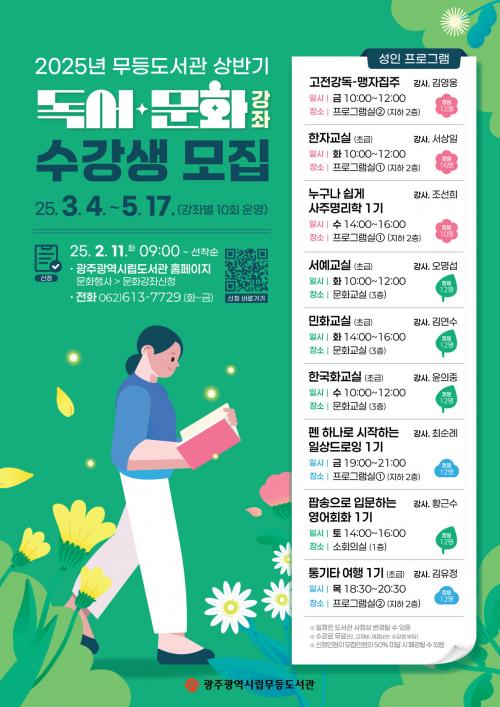 »ó¹Ý±â µ¶¼¹®È °ÁÂÀÇ ¼ö°·á´Â ¹«·áÀÌÁö¸¸ Àç·áºñ¿Í ±³Àçºñ´Â ¼ö°»ýÀÌ ºÎ´ãÇÑ´Ù. °Á ¼ö°À» Èñ¸ÁÇÏ´Â ½Ã¹ÎÀº 11ÀϺÎÅÍ ±¤ÁÖ±¤¿ª½Ã¸³µµ¼°ü ´©¸®Áý(ȨÆäÀÌÁö)ÀÇ ¡®¹®È°Á½Åû¡¯¶õÀ» ÅëÇØ Á¢¼öÇÒ ¼ö ÀÖ´Ù.