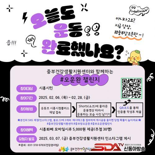 ¡®¿À¿î¿Ï 縰Áö¡¯¿¡ Âü¿©ÇϰíÀÚ ÇÏ´Â ½Ã¹ÎµéÀº ½ÃÈï½Ãû Ç÷¯½º À¯Æ©ºê ä³ÎÀ» ÅëÇØ Á¦°øµÇ´Â ¿îµ¿ ¿µ»óÀ» º¸°í µû¶ó Çϸç, ¿îµ¿ÇÏ´Â ¸ð½ÀÀ» »çÁøÀ¸·Î Âï¾î¼ ÀÎÁõÇÏ¸é µÈ´Ù. ÀÎÁõÀº Å¥¾Æ¸£(QR) Äڵ带 ÅëÇØ Á¦°øµÇ´Â ÀÎÁõÆûÀ» ÀÛ¼ºÇØ Á¦ÃâÇÏ´Â ¹æ½ÄÀ¸·Î ½ÃÈï½Ã¹Î ´©±¸³ª ½±°Ô Âü¿©ÇÒ ¼ö ÀÖ´Ù.