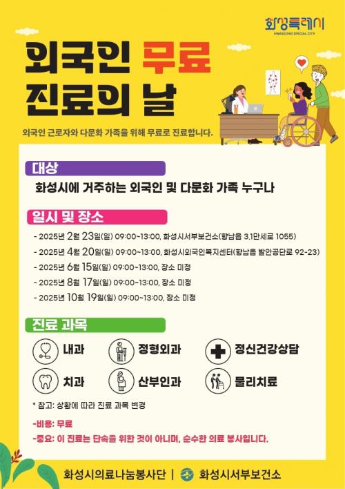 ȼºÆ¯·Ê½Ã(½ÃÀå Á¤¸í±Ù)¿Í ȼº½ÃÀǷᳪ´®ºÀ»ç´ÜÀÌ ¿Ü±¹ÀÎ ±Ù·ÎÀÚ¿Í ´Ù¹®È °¡Á¤ ÁֹΠµî ÀÇ·á Ãë¾à°èÃþÀÇ °Ç° ÁõÁøÀ» À§ÇÑ 2025³â ¹«·á Áø·á ºÀ»ç¸¦ ¿î¿µÇÑ´Ù.