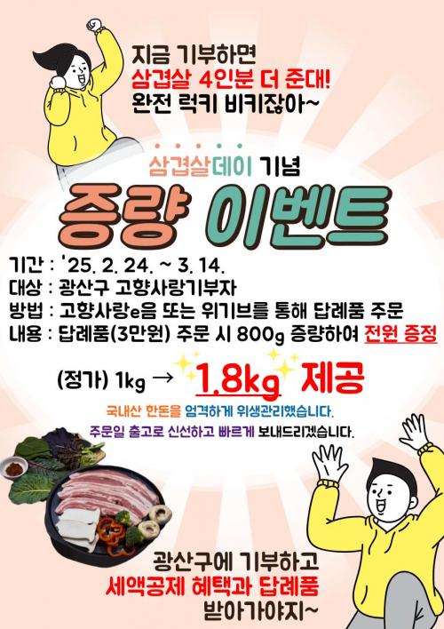 ±¤»ê±¸´Â À̺¥Æ® µ¿¾È ±¤»ê±¸ °íÇâ»ç¶û±âºÎÀÚ¸¦ ´ë»óÀ¸·Î »ï°ã»ìÀ» ¼±ÅÃÇÒ °æ¿ì, ±âÁ¸ 1§¸¿¡¼ 800g Áõ·®ÇÑ 1.8§¸À» Á¦°øÇÑ´Ù.
