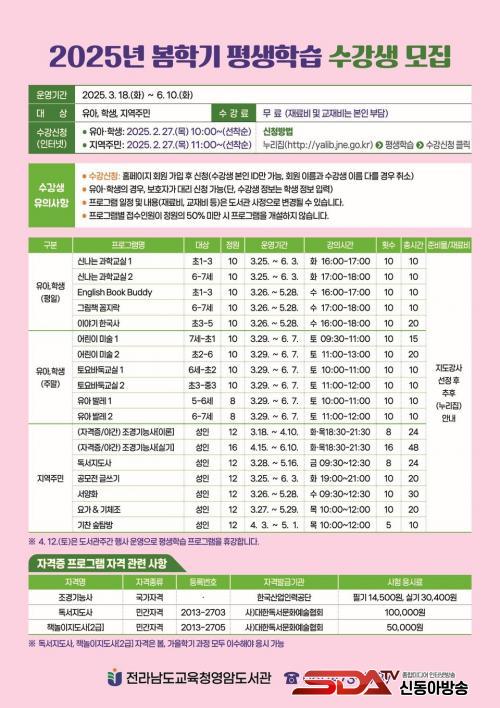 ¼ö°½ÅûÀº 2¿ù 27ÀÏ(¸ñ) 10½ÃºÎÅÍ ¼±Âø¼øÀ¸·Î ÁøÇàµÇ°í, µµ¼°ü ´©¸®Áý(http://yalib.jne.go.kr)À» ÅëÇØ ½ÅûÇÒ ¼ö ÀÖ´Ù. ¶Ç ¼ö°·á´Â ¹«·áÀ̸ç Àç·áºñ ¹× ±³Àçºñ´Â º»ÀÎ ºÎ´ãÀÌ´Ù. ±âŸ ÀÚ¼¼ÇÑ »çÇ×Àº ´©¸®Áý¿¡¼ È®ÀÎ °¡´ÉÇÏ°í µµ¼°ü(¢Ï061-473-6787)À¸·Î ¹®ÀÇÇÏ¸é µÈ´Ù.