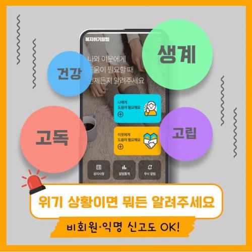 ¡®º¹ÁöÀ§±â ¾Ë¸² ¾Û¡¯Àº º¹ÁöÀ§±â »óȲ¿¡ ³õÀÎ º»ÀÎ ¶Ç´Â ÀÌ¿ôÀÇ »óȲÀ» ÈÞ´ëÀüÈ ¾ÛÀ» ÅëÇØ ¾Ë¸± ¼ö ÀÖ´Â ¼ºñ½ºÀÌ´Ù. ƯÈ÷ À§±â »óȲ¿¡ ³õÀÎ °¡±¸¸¦ ½±°í ºü¸£°Ô ½Å°íÇÒ ¼ö ÀÖ¾î ÇöÀå Áß½ÉÀÇ º¹Áö »ç°¢Áö´ë ¹ß±¼°ú Áö¿ø¿¡ ¿ëÀÌÇÏ´Ù.