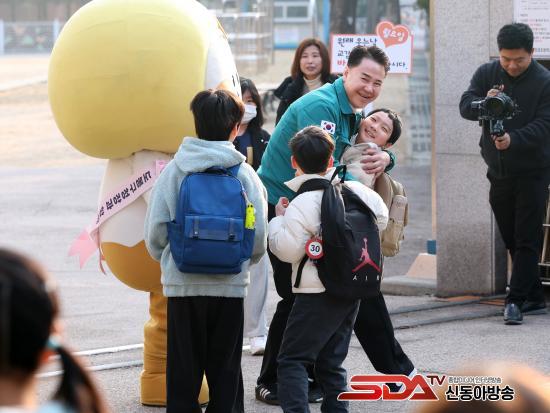 ¿À¾ð¼® µµºÀ±¸Ã»Àå(°¡¿îµ¥)ÀÌ Áö¿ª ³» ÇÑ ÃʵîÇб³ µî±·±æ¿¡¼­ Çлýµé°ú ¹Ý°©°Ô Àλ縦 ³ª´©°í ÀÖ´Ù(2025. 3. 10. â°æÃʵîÇб³)