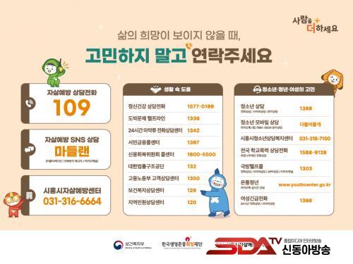 »îÀÌ ¾î·Æ°í Èñ¸ÁÀÌ º¸ÀÌÁö ¾Ê¾Æ µµ¿òÀ̳ª »ó´ãÀ» ¿øÇÒ °æ¿ì, ½ÃÈï½ÃÀڻ쿹¹æ¼¾ÅÍ¿¡ ÀüÈ(031-316-6664 (³»¼± 1-2))·Î ¿¬¶ôÇϰųª ´©¸®Áý¿¡¼ »ó´ã ¿¹¾àÀ» ÇÒ ¼ö ÀÖ´Ù. »ó´ã ½Åû ¹× ¹æ¹ý, »ç¾÷ ³»¿ë µî ´õ¿í ÀÚ¼¼ÇÑ »çÇ×Àº ½ÃÈï½ÃÀڻ쿹¹æ¼¾ÅÍ ´©¸®Áý(www.shsmhc.or.kr)À» ÅëÇØ È®ÀÎÇÒ ¼ö ÀÖ´Ù.