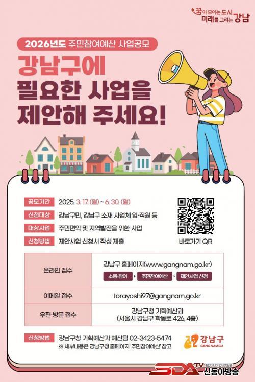 ¿Â¶óÀÎ Á¢¼ö´Â °³²±¸Ã» ȨÆäÀÌÁö¿Í ¸ÞÀÏ(torayoshi97@gangnam.go.kr)¿¡¼ ¹Þ°í ÀÖÀ¸¸ç, ¹æ¹® ¶Ç´Â ¿ìÆí Á¢¼ö´Â ±¸Ã» º»°ü 4Ãþ ±âȹ¿¹»ê°ú·Î ÇÏ¸é µÈ´Ù. ´õ ÀÚ¼¼ÇÑ ³»¿ëÀº °³²±¸Ã» ȨÆäÀÌÁö °ø°í·Î È®ÀÎÇϰųª ±âȹ¿¹»ê°ú(¢Ï02-3423-5474)·Î ¹®ÀÇÇÏ¸é µÈ´Ù.