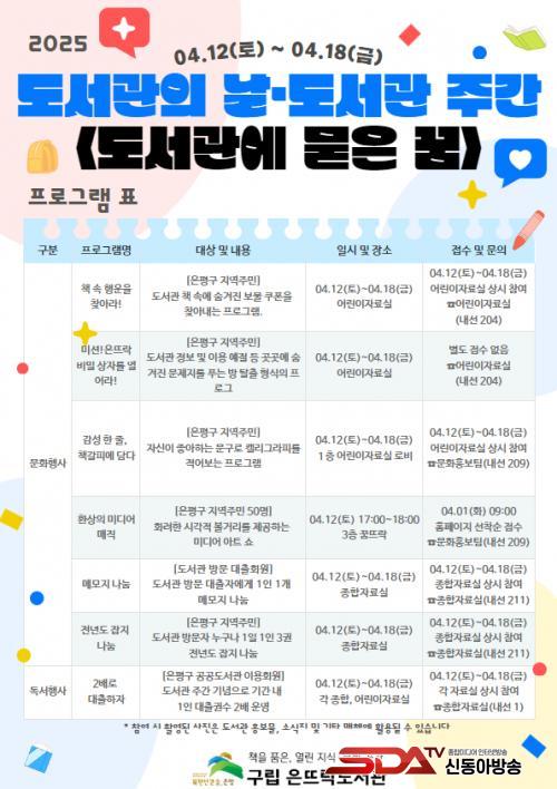 [½Åµ¿¾Æ¹æ¼Û ÀºÆò±¸=À̽ŵ¿±âÀÚ] ÀºÆò±¸´Â ±¸¸³ Àº¶ß¶ôµµ¼­°ü¿¡¼­ µµ¼­°üÀÇ ³¯¡¤µµ¼­°ü ÁÖ°£À» ±â³äÇØ ¡®²ÞÀ» Ű¿ì´Â ¾¾¾Ñ, µµ¼­°ü¿¡ ¹¯´Ù¡¯¸¦ ÁÖÁ¦·Î ¹®È­Çà»ç¿Í µ¶¼­ Çà»ç¸¦ ÁøÇàÇÑ´Ù°í ¹àÇû´Ù.