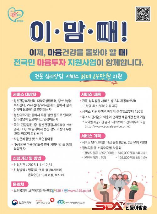 Áö¿ø ´ë»óÀº Á¤½Å°Ç°º¹Áö¼¾ÅÍ, û¼Ò³â»ó´ãº¹Áö¼¾ÅÍ µî ±¹°¡ ¹× °ø°ø±â°ü¿¡¼ ¿î¿µÇÏ´Â ½É¸®»ó´ã¼¾ÅÍ¿¡¼ »ó´ãÀÌ ÇÊ¿äÇÏ´Ù°í ÀÎÁ¤ÇØ ÀÇ·Ú¼¸¦ ¹ß±Þ¹ÞÀº ÀÚ, Á¤½ÅÀÇ·á±â°ü µî¿¡¼ »ó´ãÀÌ ÇÊ¿äÇÏ´Ù°í ÀÎÁ¤ÇØ ¼Ò°ß¼ µîÀ» ¹ß±Þ¹ÞÀº ÀÚ, ±¹°¡ °Ç°°ËÁø Áß Á¤½Å°Ç°°Ë»ç¿¡¼ Áß°£ Á¤µµ ÀÌ»óÀÇ ¿ì¿ïÀÌ È®ÀÎµÈ ÀÚ, ÀÚ¸³Áغñû³â ¹× º¸È£¿¬À徯µ¿ µîÀÌ´Ù.