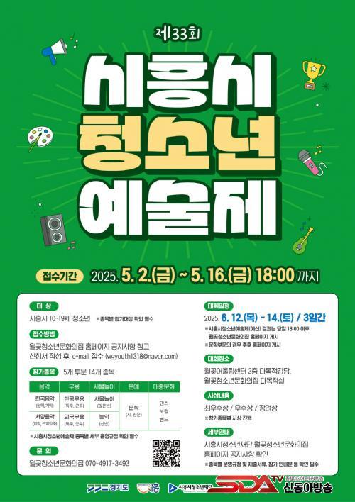 (Àç)½ÃÈï½Ãû¼Ò³âÀç´Ü °ü°èÀÚ´Â ¡°À̹ø Á¦33ȸ ½ÃÈï½Ãû¼Ò³â¿¹¼úÁ¦°¡ û¼Ò³âµé¿¡°Ô âÀÇÀû Ç¥ÇöÀÇ ±âȸ¸¦ Á¦°øÇϰí, Áö¿ª»çȸÀÇ ¹®È¿¹¼ú Ȱ¼ºÈ¿¡ ±â¿©ÇÏ±æ ±â´ëÇÑ´Ù¡±¶ó¸ç, ¡°½ÃÈï½Ã û¼Ò³âµéÀÇ Àû±ØÀûÀÎ Âü¿©¿Í ¸¹Àº °ü½ÉÀ» ºÎʵ台´Ù¡±¶ó°í ÀüÇß´Ù.