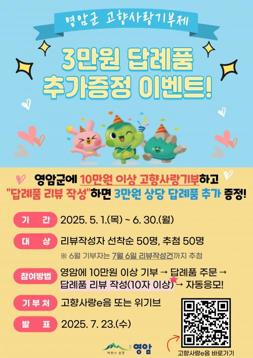 Áö¿ª Ư»ê¹° È«º¸¿Í °íÇâ»ç¶û±âºÎ ÃËÁøÀ» À§ÇÑ À̹ø Çà»ç´Â, ¿µ¾Ï±º¿¡ 10¸¸¿ø ÀÌ»ó ¿µ¾Ï»ç¶û±âºÎÇϰí, ´ä·Êǰ ¸®ºä¿¡ 10ÀÚ ÀÌ»ó ÀÛ¼ºÇÑ ±âºÎÀÚ¸¦ À§ÇÑ °ÍÀÌ´Ù.