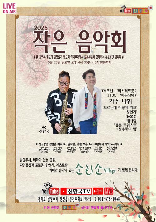 ÇöÀå¿¡¼´Â °ü°´µéÀÇ Áï¼® ½Åû°îÀ» ¹Þ¾Æ Ưº°ÇÑ ÁïÈï °ø¿¬µµ ÁøÇàµÉ ¿¹Á¤À̸ç, À½¾ÇÀ» °¡±îÀ̼ Áñ±æ ¼ö ÀÖ´Â ±âȸ°¡ µÉ Àü¸ÁÀÌ´Ù. À̹ø ÀÛÀºÀ½¾Çȸ´Â ÀÔÀå·á ¾øÀÌ ´©±¸³ª Âü¿©ÇÒ ¼ö ÀÖÀ¸¸ç, º°µµÀÇ ¿¹¾à ¾øÀÌ ÀÚÀ¯·Ó°Ô °ü¶÷ÀÌ °¡´ÉÇÏ´Ù.