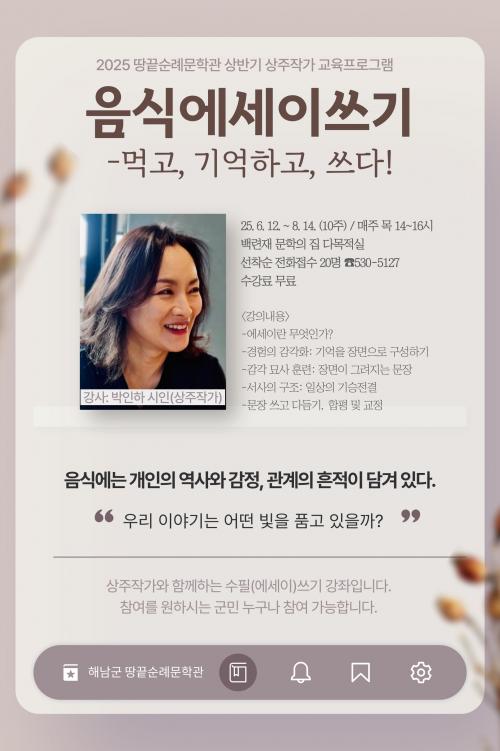 À̹ø °Á´ 2025 ¶¥³¡¼ø·Ê¹®Çаü »ó¹Ý±â »óÁÖÀÛ°¡ ±³À° ÇÁ·Î±×·¥À¸·Î, ¼ø·Ê¹®Çаü »óÁÖÀÛ°¡ÀÎ ¹ÚÀÎÇÏ ½ÃÀÎÀÌ °ÀǸ¦ ÁøÇàÇÑ´Ù.