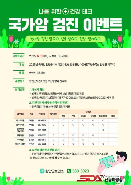 ÇØ´ç À̺¥Æ® Âü¿©¹æ¹ýÀº ±¹°¡¾Ï °ËÁø 6°³(À§¾Ï, °£¾Ï, ´ëÀå¾Ï, À¯¹æ¾Ï, ÀڱðæºÎ¾Ï, Æó¾Ï)Ç׸ñ Áß 1Á¾¸ñ ÀÌ»óÀ» ¼ö°ËÇϰí, ¾Ï°ËÁø ¼ö°ËÀ» Áõ¸íÇÏ´Â ¼·ù(°Ç°°ËÁøÈ®Àμ ¶Ç´Â °Ç°°ËÁø°á°úÁö)¿Í ½ÅºÐÁõÀ» ÁöÂüÇØ ÇԾȱºº¸°Ç¼Ò 2Ãþ º¸°ÇÇàÁ¤°ú Áø·á°è¸¦ ¹æ¹®ÇÏ¸é µÈ´Ù.