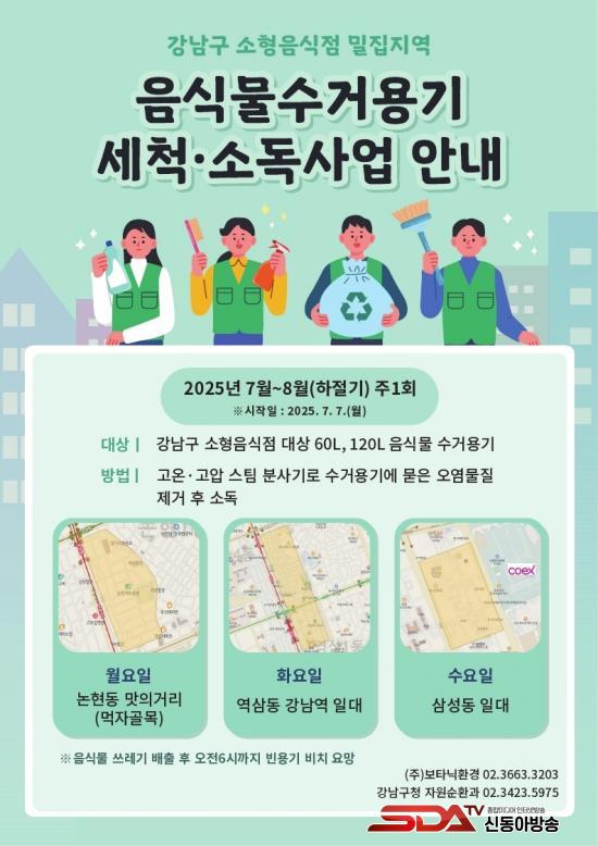 À̹ø »ç¾÷Àº °í¿Â´Ù½ÀÇÑ ¿©¸§Ã¶ ±âÈÄ·Î ÀÎÇØ À½½Ä¹° ¾²·¹±â ¼ö°Å¿ë±â¿¡¼ ¹ß»ýÇÏ´Â ¾ÇÃë, ¹ú·¹, ÇØÃæ µî À§»ý ¹®Á¦¸¦ ¼±Á¦ÀûÀ¸·Î Â÷´ÜÇϱâ À§ÇÑ Á¶Ä¡´Ù. »ç¾÷ ´ë»óÀº ³íÇöµ¿ ¸ÀÀÇ °Å¸®(Çе¿·Î 2±æ), ¿ª»ïµ¿ °³²¿ª ÀαÙ(Å×Çì¶õ·Î 1¡¤2±æ), »ï¼ºµ¿ ÀÏ´ë(Å×Çì¶õ·Î 81¡¤83±æ) µî À½½ÄÁ¡ ¹ÐÁý Áö¿ª ³» ¾à 600°÷À̸ç, °¢ ¾÷¼Ò¸¶´Ù 60L¿Í 120L ¼ö°Å ¿ë±â¸¦ ´ë»óÀ¸·Î ÁÖ 1ȸ¾¿ ÃÑ 8ȸ¿¡ °ÉÃÄ ¼¼Ã´ ¼ºñ½º¸¦ Á¦°øÇÑ´Ù.