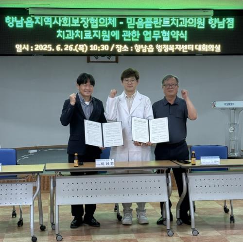 »çÁø=Çâ³²À¾Áö¿ª»çȸº¸ÀåÇùÀÇü¿Í ¹ÏÀ½ÇöõƮġ°úÀÇ¿ø Çâ³²Á¡ÀÌ 26ÀÏ Ä¡°úÄ¡·áÁö¿øÀ» À§ÇÑ ¾÷¹«Çù¾àÀ» ü°áÇß´Ù.(¿ÞÂʺÎÅÍ À̼º¼· °ø°øÀ§¿øÀå, ¹Î¿µ¼· Çâ³²À¾Àå, ¿À°­¼® ¹Î°£À§¿øÀå)