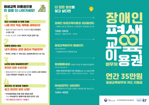 - Àå¾ÖÀÎ Æò»ý±³À°ÀÌ¿ë±Ç ½ÅûÀ» ÅëÇØ 1ÀÎ´ç ¿¬ 35¸¸¿ø ±³À°ºñ Áö¿ø