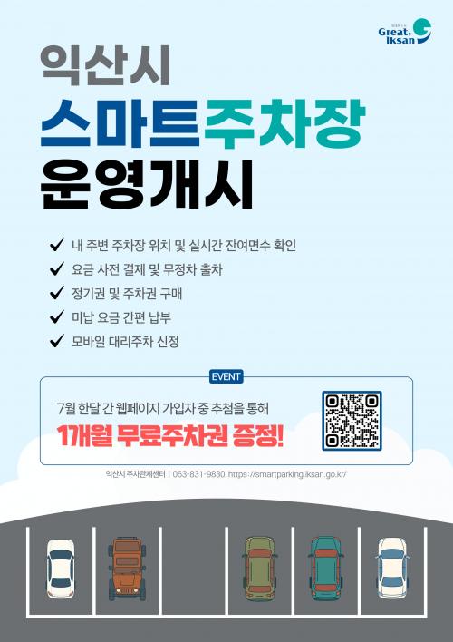 ½º¸¶Æ® ÁÖÂ÷ ÅëÇÕ ¼ºñ½º´Â ÀΰøÁö´É(AI)°ú ºòµ¥ÀÌÅÍ, īī¿À¸ðºô¸®Æ¼ÀÇ ÁÖÂ÷ Ç÷§ÆûÀ» Á¢¸ñÇØ ±¸ÃàÇÑ Ã·´Ü ½Ã½ºÅÛÀÌ´Ù. 'ÀÍ»ê½Ã ½º¸¶Æ® ÁÖÂ÷ ´©¸®Áý(smartparking.iksan.go.kr)' ¶Ç´Â 'īī¿ÀT ¾Û'À» ÅëÇØ ´©±¸³ª ÀÌ¿ëÇÒ ¼ö ÀÖ´Ù. ½º¸¶Æ® ÁÖÂ÷ ´©¸®ÁýÀº ÀÍ»ê½Ã °ø½Ä ´©¸®Áý ÃʱâȸéÀ» ÅëÇØ Á¢¼ÓÇÒ ¼ö ÀÖ´Ù.