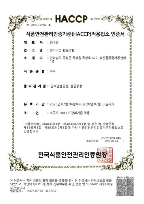 HACCPÀº ½ÄǰÀÇ »ý»êºÎÅÍ ¼Òºñ±îÁö Àü °úÁ¤¿¡¼ ¹ß»ý °¡´ÉÇÑ À§ÇØ¿ä¼Ò¸¦ »çÀü¿¡ ºÐ¼®Çϰí, À̸¦ ÁßÁ¡ÀûÀ¸·Î °ü¸®ÇÏ¿© ½ÄǰÀÇ ¾ÈÀü¼ºÀ» È®º¸ÇÏ´Â °úÇÐÀû À§»ý°ü¸® ü°èÀ̸ç, À̹ø¿¡ ÀÎÁõÀ» ¹ÞÀº ǰ¸ñÀº ¡ã°úÀÚ·ù ¡ã¶±·ù ¡ã°î·ù°¡°øÇ° ¡ã±âŸ °¡°øÇ° ¡ãÀë µî ÃÑ 5°³ À¯ÇüÀ¸·Î, ÀÎÁõ À¯È¿±â°£Àº 2025³â 7¿ù 4ÀϺÎÅÍ 2028³â 7¿ù 3ÀϱîÁö 3³â°£ÀÌ´Ù.