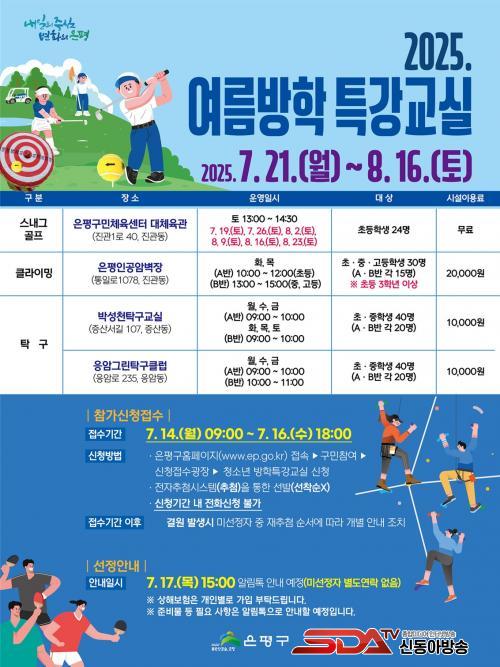 Âü°¡ ´ë»óÀº ÀºÆò±¸ °ÅÁÖ ÃÊ¡¤Áß¡¤°íµîÇлýÀ̸ç, ¸ðÁýÀοøÀº ½º³»±×°ñÇÁ 24¸í, Ŭ¶óÀÌ¹Ö 30¸í, ʱ¸ 80¸íÀÌ´Ù. ¸ðµç ¼ö¾÷Àº Àü¹® ÁöµµÀÚ°¡ ÁøÇàÇϸç, ¼ö°»ýµéÀº ±âÃʺÎÅÍ Ã¼°èÀûÀ¸·Î ¹è¿ì°Ô µÈ´Ù.