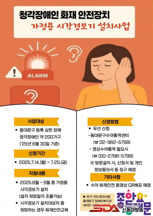 ±¸´Â û°¢Àå¾ÖÀÎÀÇ ½Åû°ú Á¢¼ö, ¼³Ä¡°¡ ¿øÈ°È÷ ÀÌ·ïÁöµµ·Ï µ¿´ë¹®±¸¼ö¾îÅ뿪¼¾ÅÍ¿Í Çù·ÂÇØ »ç¾÷À» ÁøÇàÇÑ´Ù. ¿ì¼± ½ÉÇÑ Ã»°¢Àå¾Ö°¡ ÀÖ´Â ¾à 408°¡±¸¸¦ ´ë»óÀ¸·Î ¿ìÆíÀ¸·Î »ç¾÷ ¾È³»¸¦ ¹ß¼ÛÇϰí, ¿À´Â 14ÀϺÎÅÍ 25ÀϱîÁö ¼¾ÅÍ¿¡¼ À¯¼± ¾È³»¸¦ ÅëÇØ ½Åû Àǻ縦 È®ÀÎÇÒ ¿¹Á¤ÀÌ´Ù. ÀÌÈÄ ¿ì¼±¼øÀ§ µîÀ» Á¾ÇÕÀûÀ¸·Î °í·ÁÇØ ÃÖÁ¾ÀûÀ¸·Î ¾à 200°¡±¸¸¦ ¼±Á¤Çϰí, °¡Á¤À» ¹æ¹®ÇØ ½Ã°¢°æº¸±â¸¦ ¼³Ä¡ÇÑ´Ù.