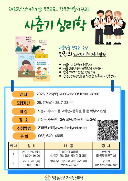 ½É ¹Î ±º¼ö´Â ¡°»çÃá±â´Â ÀÚ³à¿Í ºÎ¸ð ¸ðµÎ¿¡°Ô Áß¿äÇÑ ½Ã±âÀÎ ¸¸Å, À̹ø ±³À°À» ÅëÇØ °¥µîÀ» ÁÙÀÌ°í °Ç°ÇÑ °¡Á·°ü°è¸¦ Çü¼ºÇÏ´Â µ¥ µµ¿òÀÌ µÇ±â¸¦ ±â´ëÇÑ´Ù¡±°í ¸»Çß´Ù.