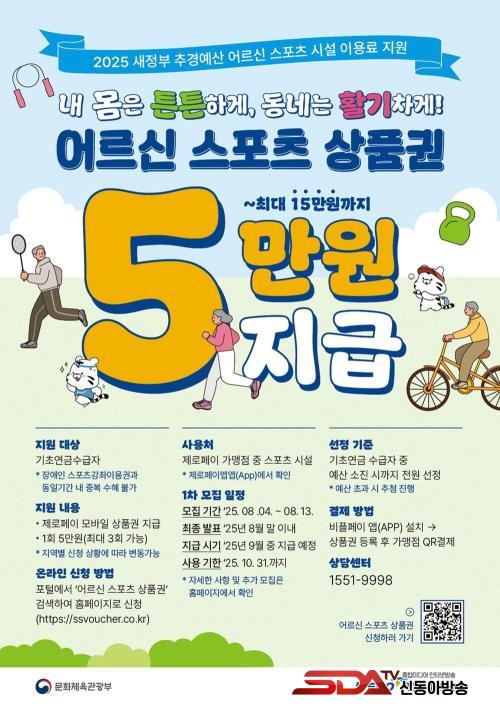 Áö¿ø ´ë»óÀº °ü³» ¸¸ 65¼¼ ÀÌ»ó ±âÃÊ¿¬±Ý¼ö±ÞÀÚÀ̸ç, ÁøÁÖ½ÃÀÇ ´ë»óÀÚ´Â ¾à 4¸¸ 9000¸íÀÌ´Ù. 1Àδç 5¸¸ ¿ø¾¿ ¾î¸£½Å ½ºÆ÷Ã÷ »óǰ±ÇÀÌ Áö±ÞµÇ¸ç, Àü±¹ÀÇ Á¦·ÎÆäÀÌ °¡¸Í ½ºÆ÷Ã÷½Ã¼³¿¡¼ »ç¿ë °¡´ÉÇÏ´Ù. 1Â÷ ½ÅûÀº 8¿ù 4ÀϺÎÅÍ 13ÀÏ ¿ÀÈÄ 6½Ã±îÁö °¡´ÉÇÏ´Ù.