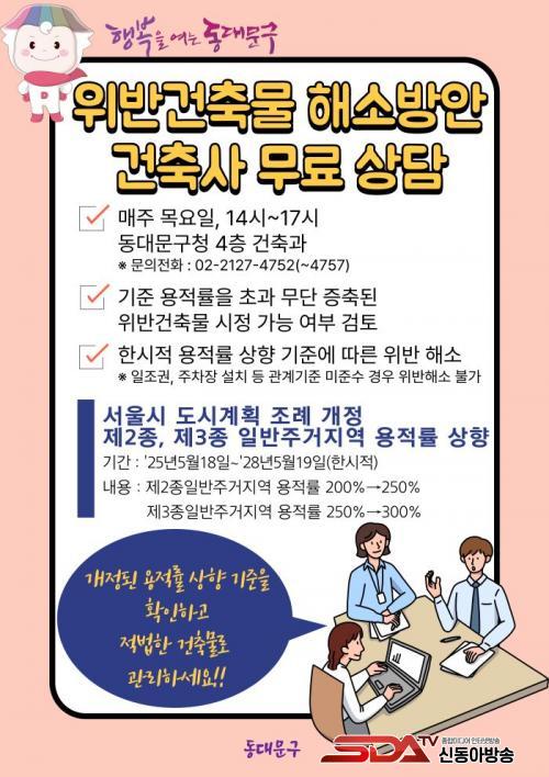 µ¿´ë¹®±¸´Â ¹«´Ü ÁõÃàÀ¸·Î ºÒÀÌÀÍÀ» °Þ´Â °ÇÃàÁÖµéÀÌ ¿ëÀû·ü »óÇâ Á¦µµÀÇ ÇýÅÃÀ» ¹ÞÀ» ¼ö ÀÖµµ·Ï ¹«·á °ÇÃà»ç »ó´ãÀ» ¿î¿µÇÑ´Ù. ¸ÅÁÖ ¸ñ¿äÀÏ ¿ÀÈÄ 2½ÃºÎÅÍ 5½Ã±îÁö ±¸Ã» 4Ãþ °ÇÃà°ú »ó´ã½Ç¿¡¼ À§¹Ý°ÇÃà ÇØ¼Ò °¡´É ¿©ºÎºÎÅÍ ÀýÂ÷, Áغñ¼·ù±îÁö ¸ÂÃãÇü Á¤º¸¸¦ Á¦°ø¹ÞÀ» ¼ö ÀÖ´Ù.