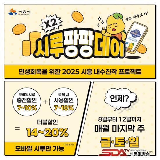 ½ÃÈï½ÃÀÇ 2025³â ÇϹݱ⠹λýȸº¹ ÇÁ·ÎÁ§Æ® ¡®ÈïÇØ¶ó Èï¼¼ÀÏ¡¯ÀÇ ÇÙ½É À̺¥Æ®ÀÎ ½Ã·çÆÎÆÎµ¥ÀÌ´Â ½ÃÈï½Ã Áö¿ªÈÆó ¸ð¹ÙÀÏ ¡®½Ã·ç¡¯ ÃæÀü ½Ã 7~10%¸¦ ÇÒÀιްí, ½Ã·ç °¡¸ÍÁ¡¿¡¼ °áÁ¦ ½Ã Ãß°¡·Î 7~10%¸¦ ÇÒÀι޴ 2¹è ÇÒÀÎ Çà»ç´Ù.