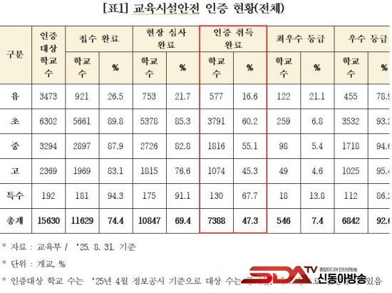 ¡à ±¹È¸ ±³À°À§¿øÈ¸ ¹é½Â¾Æ ÀÇ¿ø(´õºÒ¾î¹ÎÁÖ´ç)ÀÌ ±³À°ºÎ·ÎºÎÅÍ ¹ÞÀº ¡®±³À°½Ã¼³ ¾ÈÀüÀÎÁõÇöȲ¡¯ÀÚ·á¿¡ µû¸£¸é, ±³À°½Ã¼³¾ÈÀü ÀÎÁõ ´ë»ó À¯¡¤ÃÊ¡¤Áß¡¤°í¡¤Æ¯¼öÇб³ 15,630°³±³ Áß 7,388°³±³(47.3%)¸¸ÀÌ ÀÎÁõ ÃëµæÀ» ¿Ï·áÇÑ °ÍÀ¸·Î µå·¯³µ´Ù. ±³À°½Ã¼³¹ý¿¡¼ Á¤Çϰí ÀÖ´Â Àüü ±³À°½Ã¼³Àº ÇöÇà¹ý»ó ¿ÃÇØ 12¿ù 3ÀϱîÁö ±³À°½Ã¼³ ¾ÈÀüÀÎÁõÀ» Àǹ«ÀûÀ¸·Î ¹Þ¾Æ¾ß ÇÏÁö¸¸, ÀÎÁõ ±âÇÑÀ» 3°³¿ù °¡·® ¾ÕµÎ°íµµ Àý¹Ýµµ ¾È µÇ´Â Çб³µéÀÌ ¾ÆÁ÷±îÁö ÀÎÁõÀ» ¹ÞÁö ¸øÇÑ °ÍÀÌ´Ù.