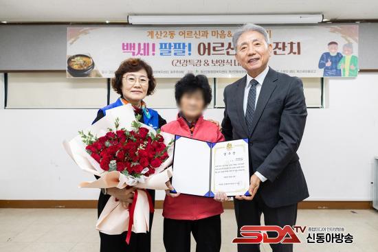 À̳¯ º¸ÀåÇùÀÇü´Â °è»ê2µ¿ Áö¿ª 100¼¼ ÀÌ»ó ¾î¸£½Å Áß °Åµ¿ÀÌ °¡´ÉÇÑ ÃÖ°í·É ¾î¸£½Å¿¡°Ô ¡®Àå¼ö»ó¡¯À» Àü´ÞÇÏ¸ç ¹«º´Àå¼ö¿Í °æ·ÎȿģÀÇ ¶æÀ» ÀüÇß°í, Çà»çÀåÀº ¿ôÀ½ÀÌ °¡µæÇÑ µû¶æÇÑ ºÐÀ§±â·Î ¹°µé¾ú´Ù.