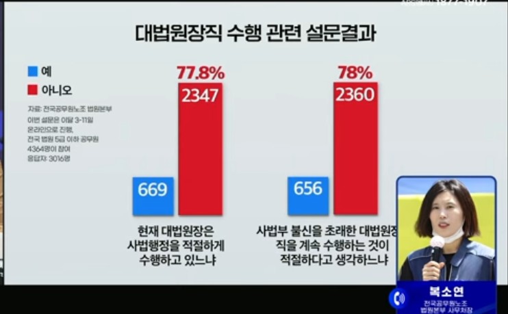 ¹ý¿øº»ºÎ´Â, Á¶Èñ´ë ´ë¹ý¿øÀåÀÇ »ç¹ýºÎ µ¶¸³ ¼öÈ£ ½ÇÆÐ¿Í ±¹¹Î±âº»±Ç º¸È£ ¿ªÇÒ ¹æ±â, »ç¹ýÇàÁ¤ Á߸³¼º ÈÑ¼Õ µî ÀÌÀ¯·Î ´õ ÀÌ»ó »ç¹ýºÎ ¼öÀåÁ÷À» ¼öÇàÇÒ ¼ö ¾ø´Ù°í °á·ÐÁþ°í, Áï°¢ÀûÀÎ »çÅ𸦠°Åµì Ã˱¸Çϸé¼, ¡°»ç¹ýºÎ ½Å·Ú ȸº¹ÀÇ Ã¹°ÉÀ½Àº Ã¥ÀÓ ÀÖ´Â °á´ÜÀ̸ç, ¹ý¿ø°ø¹«¿øÀÇ ¾ÐµµÀû Àǻ簡 °ð ±¹¹ÎÀÇ ¶æ¡±À̶ó°í ¹àÇû´Ù.