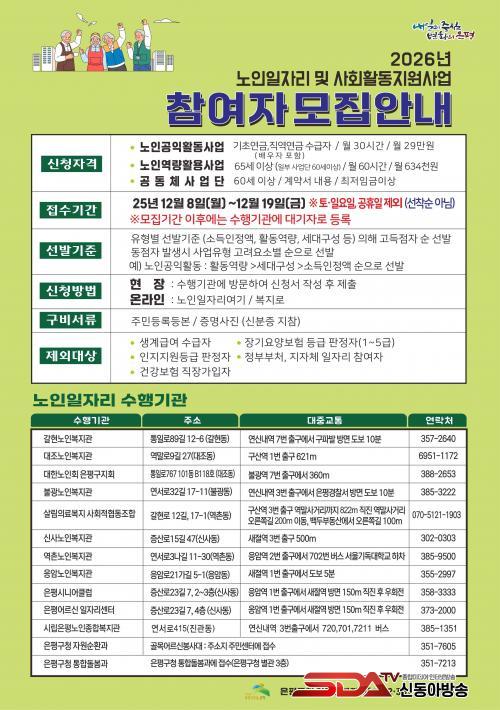 Âü¿©¸¦ Èñ¸ÁÇÏ´Â ¾î¸£½ÅÀº ½ÅºÐÁõ°ú Áֹεî·Ïµîº» µîÀ» ÁöÂüÇØ ³ëÀÎÀÏÀÚ¸® ¼öÇà±â°üÀÎ ÀºÆò½Ã´Ï¾îŬ·´, ´ëÇѳëÀÎȸÀºÆò±¸Áöȸ, »ì¸²ÀǷẹÁö»çȸÀûÇùµ¿Á¶ÇÕ, ³ëÀκ¹Áö°ü µî¿¡ ¹æ¹®ÇØ ½ÅûÇÏ¸é µÈ´Ù. °ñ¸ñ¾î¸£½ÅºÀ»ç´ë´Â ÇØ´ç µ¿ Áֹμ¾ÅÍ¿¡¼, ÀºÆò¾ÈºÎ»ìÇǹ̴ ÅëÇÕµ¹º½°ú¿¡¼ Á¢¼öÇÑ´Ù.