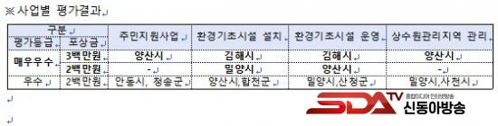 ÁöÀÚüº° Áֿ伺°ú·Î´Â, ¾ç»ê½Ã´Â ÁÖ¹ÎÁö¿ø»ç¾÷, ȯ°æ±âÃʽü³ ¿î¿µ»ç¾÷, »ó¼ö¿ø°ü¸®Áö¿ª °ü¸®»ç¾÷ µî 3°³ ºÐ¾ß¿¡¼­ ¡®¸Å¿ì¿ì¼ö¡¯ µî±ÞÀ» ¹Þ¾ÒÀ¸¸ç, ±èÇØ½Ã´Â ȯ°æ±âÃʽü³ ¼³Ä¡ »ç¾÷°ú ȯ°æ±âÃʽü³ ¿î¿µ »ç¾÷ 2°³ ºÐ¾ß¿¡¼­ ¡®¸Å¿ì¿ì¼ö¡¯ µî±ÞÀ» ¹Þ¾Ò´Ù.