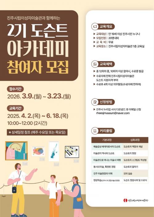 ±³À° Âü°¡ÀÚ´Â ¸¸ 19¼¼ ÀÌ»óÀÇ ÁøÁÖ ½Ã¹ÎÀ¸·Î, ¹Ì¼ú°ú ¹®È¿¹¼ú¿¡ °ü½ÉÀÌ ÀÖÀ¸¸é ´©±¸³ª Áö¿øÇÒ ¼ö ÀÖ´Ù. Âü°¡ ½ÅûÀº ÁøÁÖ½Ãû ´©¸®Áý(www.jinju.go.kr)¿¡¼ ½Åû¼¸¦ ³»·Á¹Þ¾Æ À̸ÞÀÏ(rheesjmuseum@naver.com)·Î Á¢¼öÇÏ¸é µÈ´Ù.