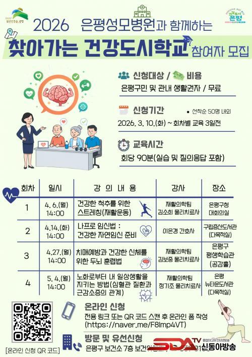 ±³À°Àº ´ÙÀ½ ´Þ 6ÀϺÎÅÍ 5¿ù 4ÀϱîÁö ÃÑ 4ȸ ¿î¿µµÇ¸ç, ÀºÆò±¸¹Î°ú °ü³» »ýȰ±ÇÀÚ¸¦ ´ë»óÀ¸·Î ȸÂ÷º° 50¸í ³»¿Ü¸¦ ¼±Âø¼ø ¸ðÁýÇÑ´Ù. ½ÅûÀº °¢ ȸÂ÷ ±³À° ½ÃÀÛ 3ÀÏ Àü±îÁö º¸°Ç¼Ò ¹æ¹®, ÀüÈ(02-351-8160) ¶Ç´Â È«º¸¹° Å¥¾Ë(QR)ÄÚµå Á¢¼ÓÀ» ÅëÇØ °¡´ÉÇÏ´Ù.