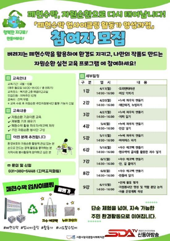 À̹ø ±³À°Àº 4¿ùºÎÅÍ 6¿ù±îÁö ¸ÅÁÖ ¿ù¿äÀÏ ¿ÀÈÄ 2½ÃºÎÅÍ 4½Ã±îÁö ÃÑ 8ȸ±â·Î ÁøÇàµÇ¸ç, º¹Áö°ü 2Ãþ ¹è¿òÅÍ2±³½Ç¿¡¼ ¿î¿µµÈ´Ù. ¸ðÁý ÀοøÀº Áö¿ªÁֹΠ10¸íÀ¸·Î, ±³À°ºñ´Â Àü¾× ¹«·á´Ù.